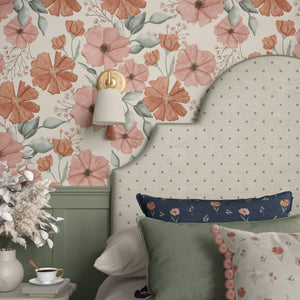 Celebrate the beauty of autumn nights with this hand-painted seamless pattern, featuring delicate wildflowers in warm rust and peachy-pink tones, accented by sage green leaves and sprigs on a rich navy background. The deep palette and watercolor style add a rustic, timeless feel. Perfect for fall-inspired designs with a moody, seasonal touch.